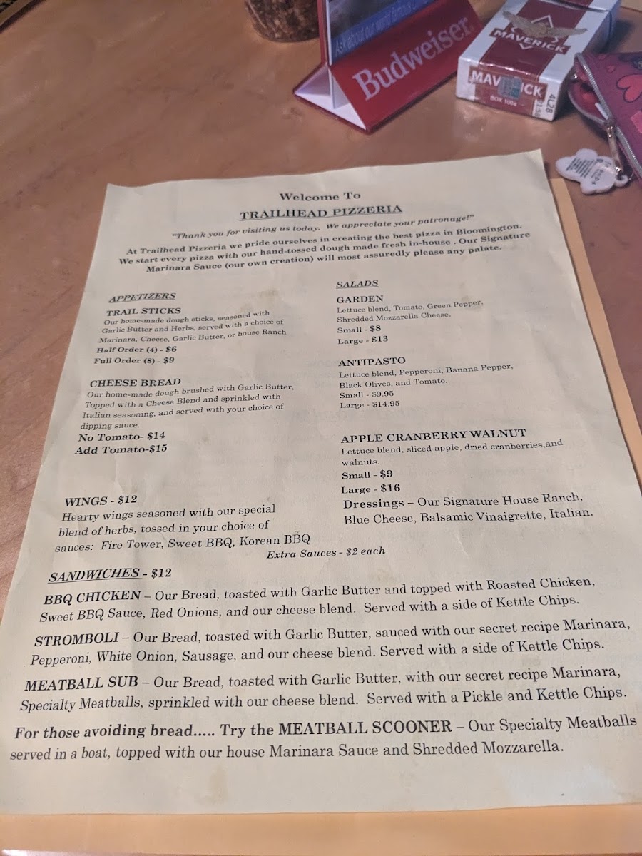Welcome to Trailhead Pizzeria, a culinary gem nestled at 4303 State Hwy 446 in Bloomington, Indiana. This charming pizzeria prides itself on a menu where everything is handcrafted, from the mouthwatering pizzas to the delectable breadsticks served fresh at your table. Each dish is a testament to quality, offering bold flavors that encourage a slow, savoring experience.